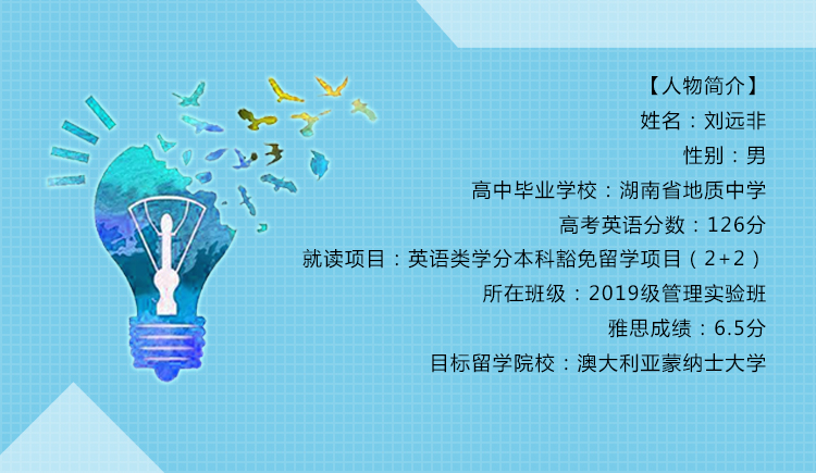 他,叫刘远非,个头中等,体形瘦削,戴着一副银色方框眼镜,露出微微的笑容,显得斯文而低调。在前不久的雅思考试中,他首战即拿到了6.5分的好成绩。今天,就让我们走近他,和他一起分享追逐留学梦想中的青春故事。