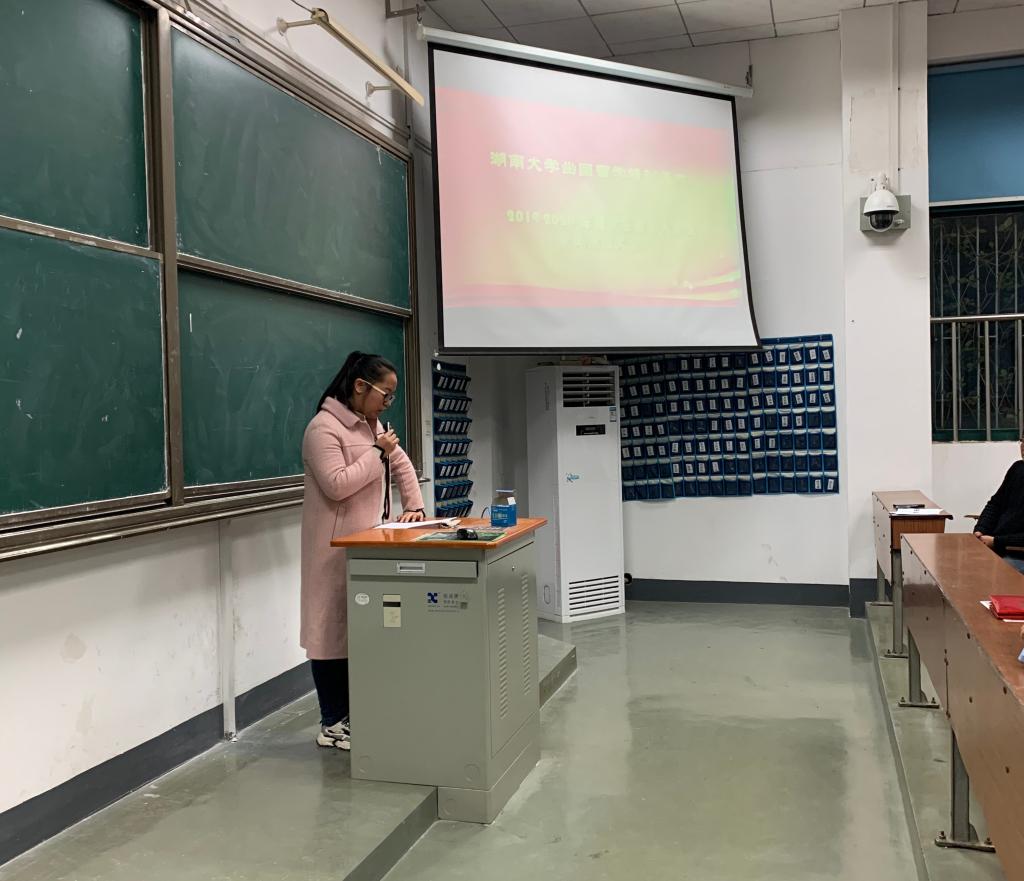 12月2日晚上,湖南大学出国留学培训基地在201阶梯教室举行了2019-2020年度学生表彰及学风建设大会。招生与学工办向磊主任、项目建设与教务办唐伟主任、招生与学工办戴杨副主任、各班班主任老师及2019级、2020级全体学生参加了此次会议。会议由招生与学工办周广雅老师主持。向磊主任作《跨越 奋进》主题发言。