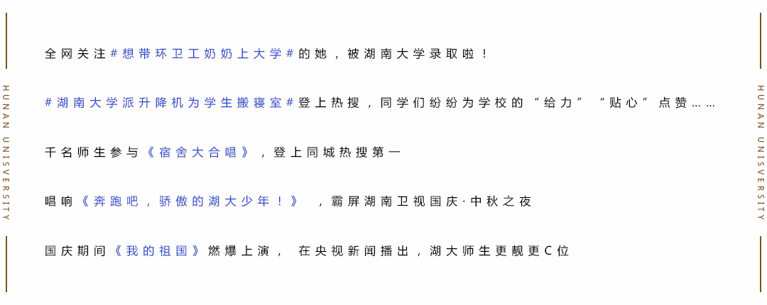 《这里,很湖大》系列立足不同的视角,从学习生活到园区服务,从校园角落到央视舞台,展示敦厚笃实、积极进取、开放包容的湖大气质,彰显着湖大以人为本的办学理念,展示着湖大人独特的面貌与风采。