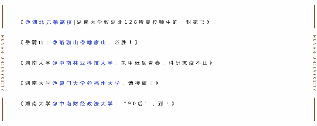 2020年4月26日起至10月27日,湖南大学官方微信不定期推出《90后,到!》系列推送共8篇,湖大青年学子积极响应国家号召,投身战“疫”一线,奋战脱贫攻坚……他们有理想、有本领、有担当,让青春在党和人民最需要的地方绽放绚丽之花,用实际行动呐喊着:“90后,到!”