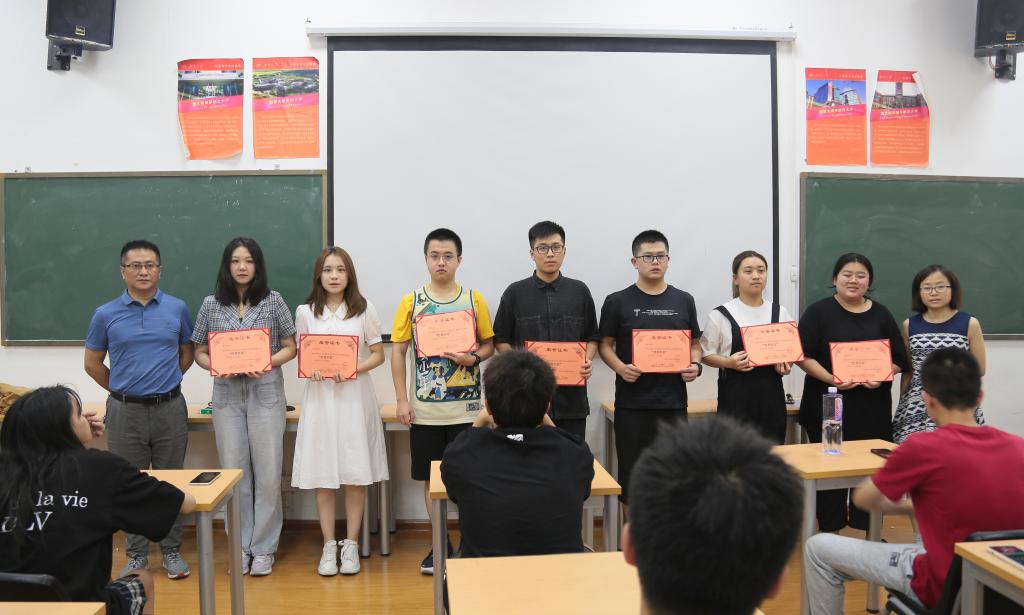 △向磊主任(左一)和贺越老师(右一)为获得“优秀学员”的同学颁发获奖证书