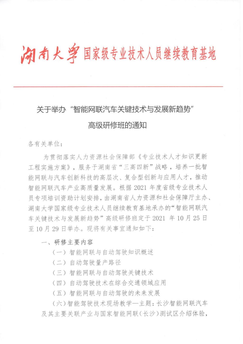 【国家基地】关于举办“智能网联汽车关键技术与发展新趋势”高级研修班的通知