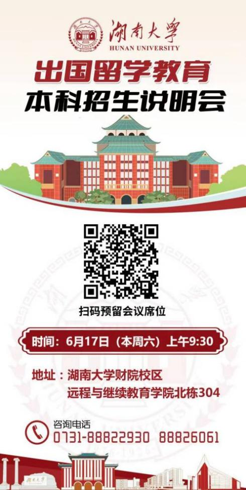 为了帮助广大高考考生及家长了解湖南大学出国留学教育的办学优势和特色、本科留学招生项目以及报名方式、录取办法等,兹定于6月17日(本周六)上午9:30在湖南大学财院校区远程与继续教育学院北栋304举行“2023年湖南大学出国留学教育本科招生说明会”。