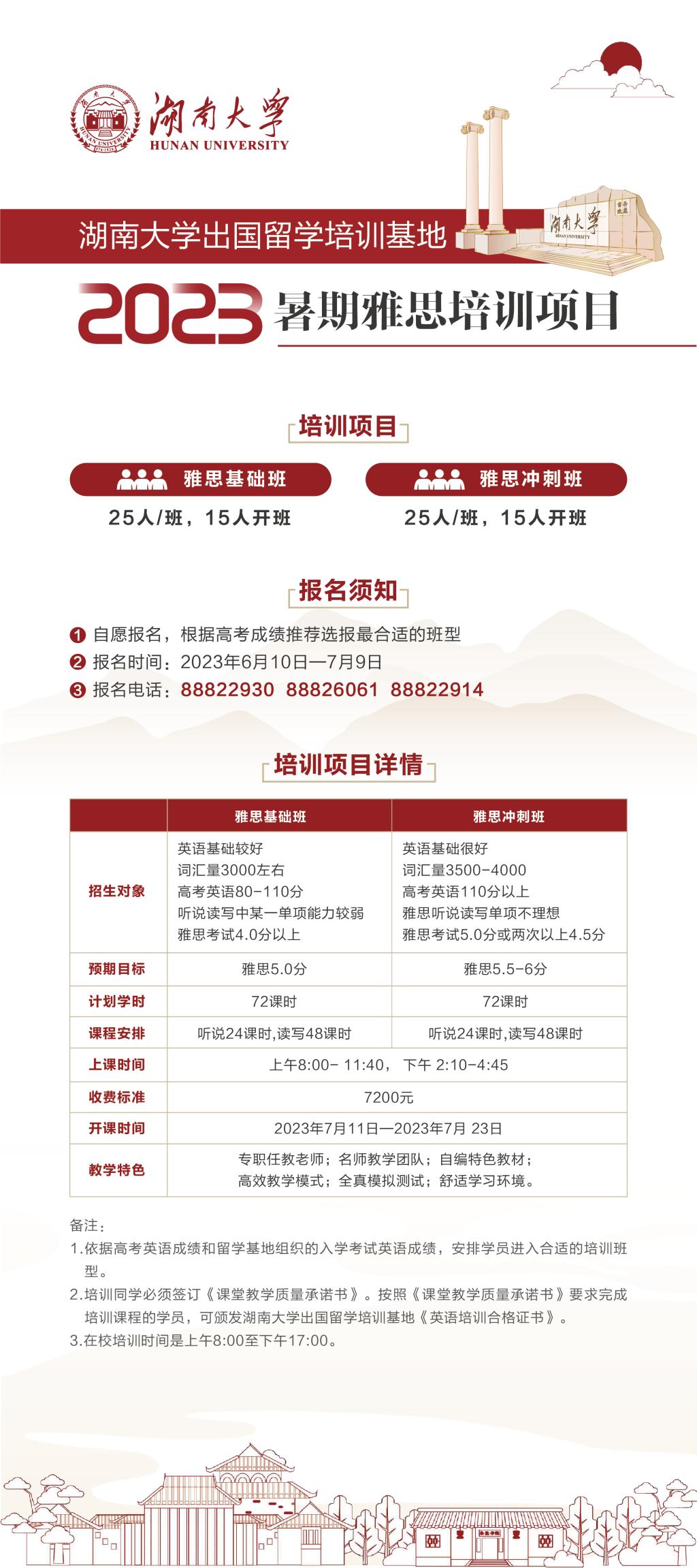 为满足莘莘学子提高英语能力、雅思学习技巧,顺利实现出国留学的目标,湖南大学出国留学培训基地依托湖南大学优质教育教学资源和丰富的雅思培训经验,特开办2023年暑期雅思培训班。培训班分为雅思基础班和冲刺班,欢迎同学们根据自身的英语基础选报不同的班型。