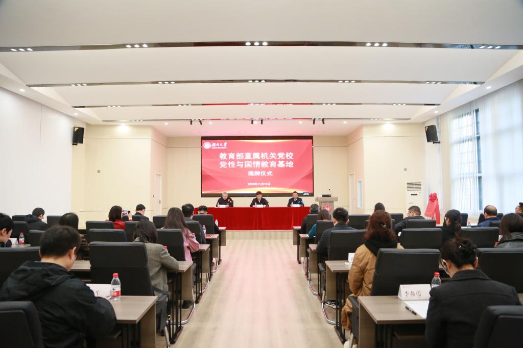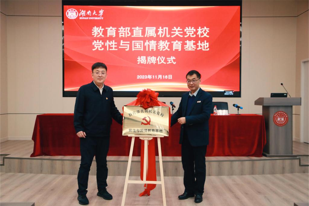 会上,双方领导共同为教育部直属机关党校党性与国情教育基地(湖南大学)揭牌。湖南大学普通教育与继续教育管理办公室主任尹新、湖南大学校办公室副主任黄克勇、湖南大学远程与继续教育学院副院长甘露以及教育部直属机关党性与国情教育培训班全体学员共同参加。
